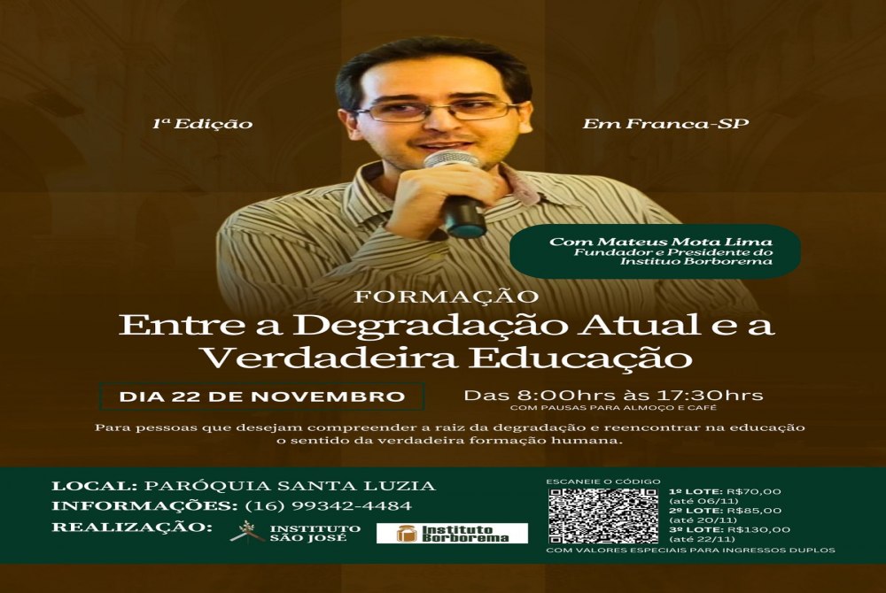Franca recebe neste Sabado (22) uma imersão especial com Matheus Motta Lima, referência nacional em formação espiritual, vida de oração e fortalecimento dos valores familiares. O encontro, promovido pelo Instituto São José, tem como propósito oferecer conhecimento, inspiração e aprofundamento para católicos e todos que reconhecem a importância da família como base da sociedade.